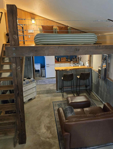 The Tiny House includes a sleeping loft with a queen bed, a pull out coach, beautiful kitchen,